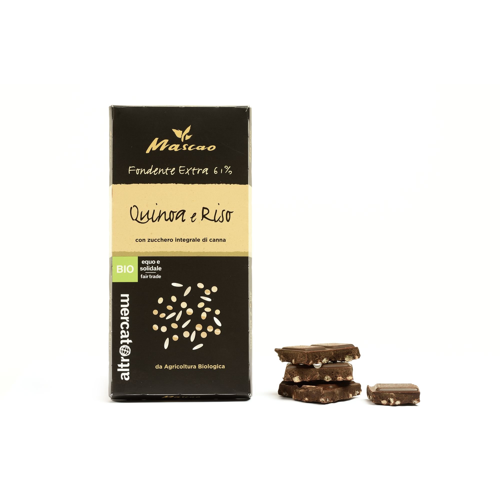 Mascao fondente extra con quinoa e riso è un cioccolato biologico dal profumo intenso di cacao e di cereali tostati. In bocca emergono inizialmente i sentori di tostato dei cereali, seguiti dalla personalità forte e persistente del cacao. Mascao fondente extra con quinoa e riso è prodotto con cacao e zucchero di canna provenienti da produttori del Commercio Equo e Solidale.